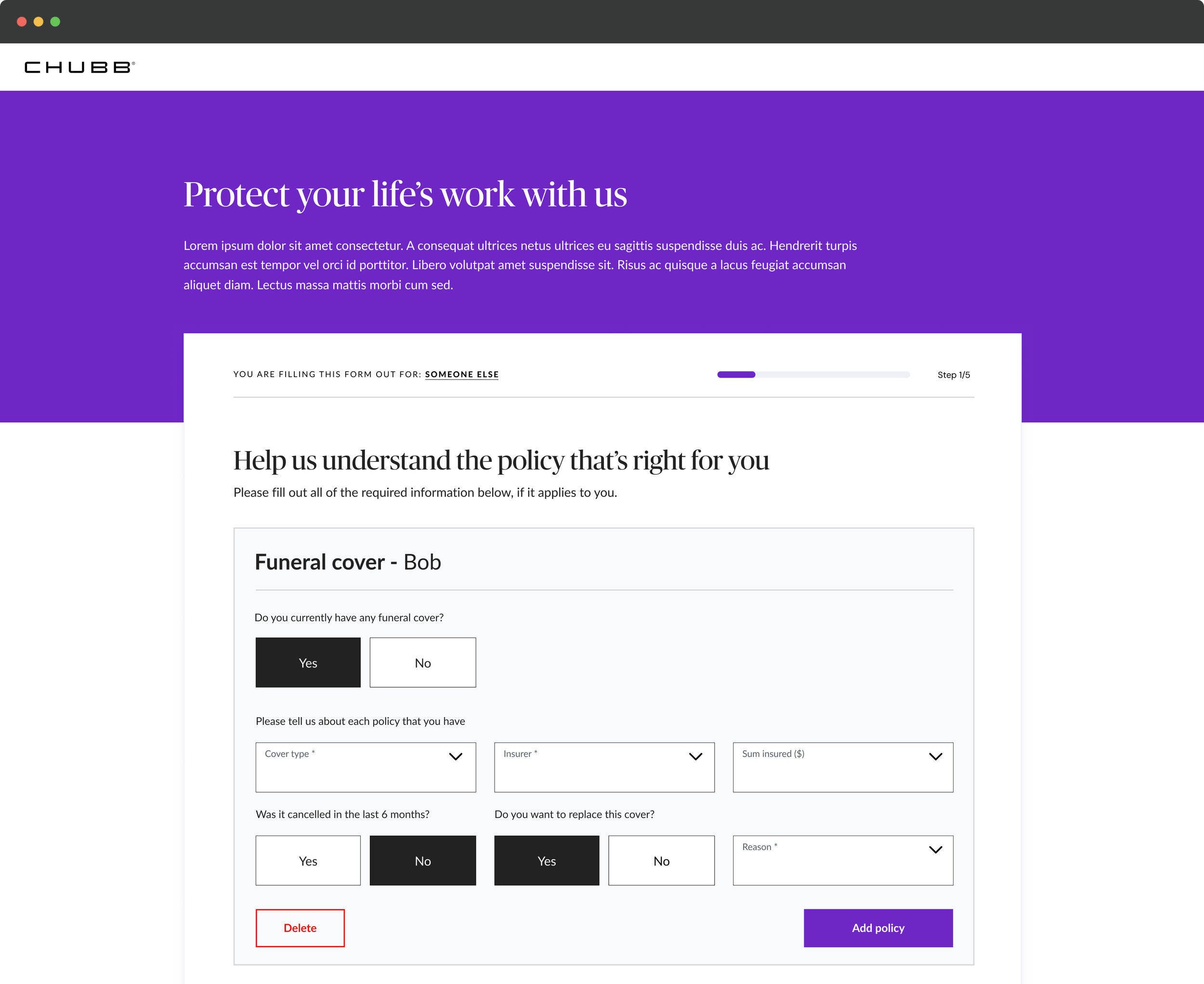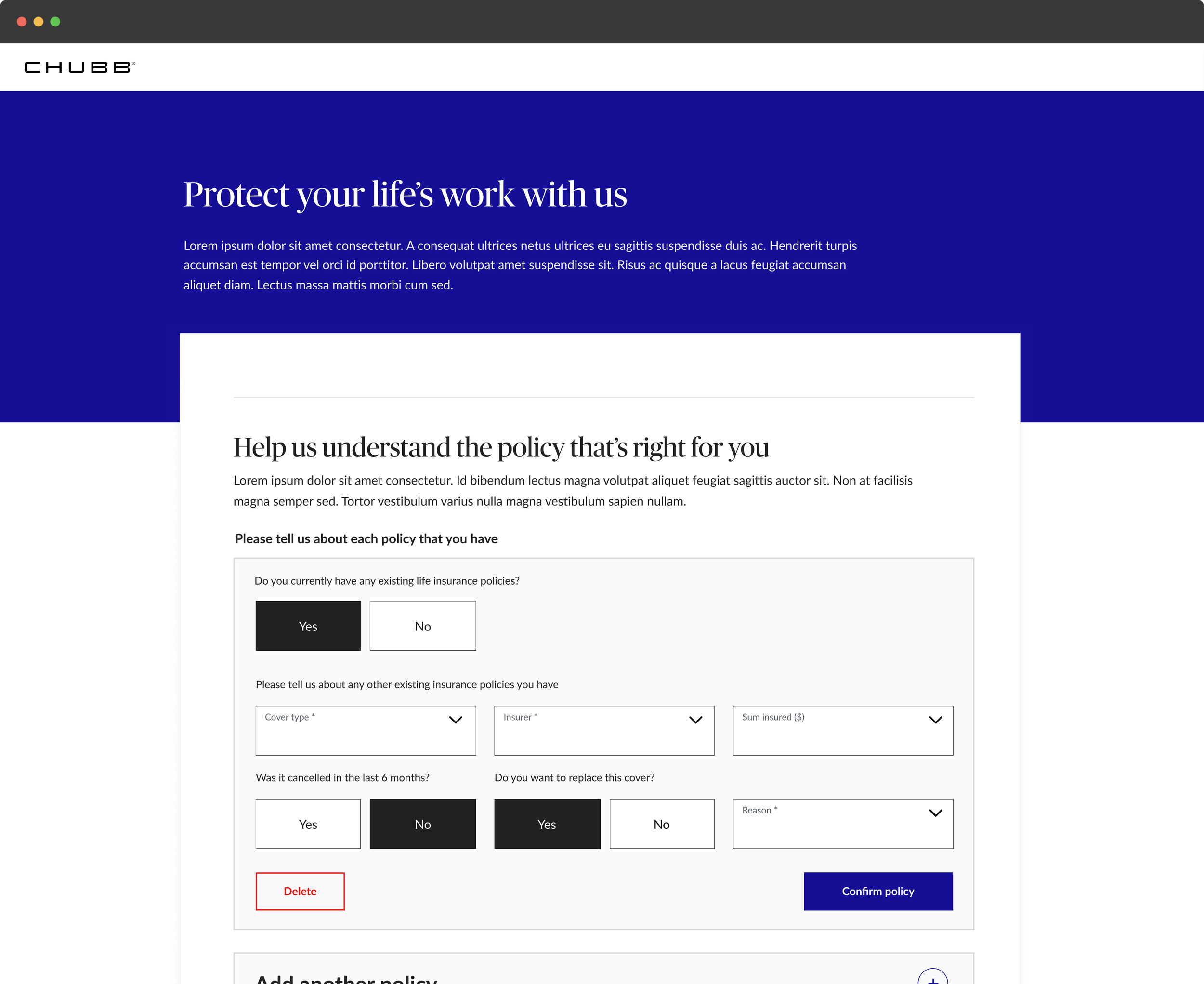 Each project that we completed for Chubb delivered a seamless, intuitive experience for their users. They ensure that users can complete applications efficiently, with clear guidance at every step, while reducing errors and frustration. For the business, it strengthens customer trust, supports brand credibility, and increases conversion rates by making the process accessible and user-friendly.