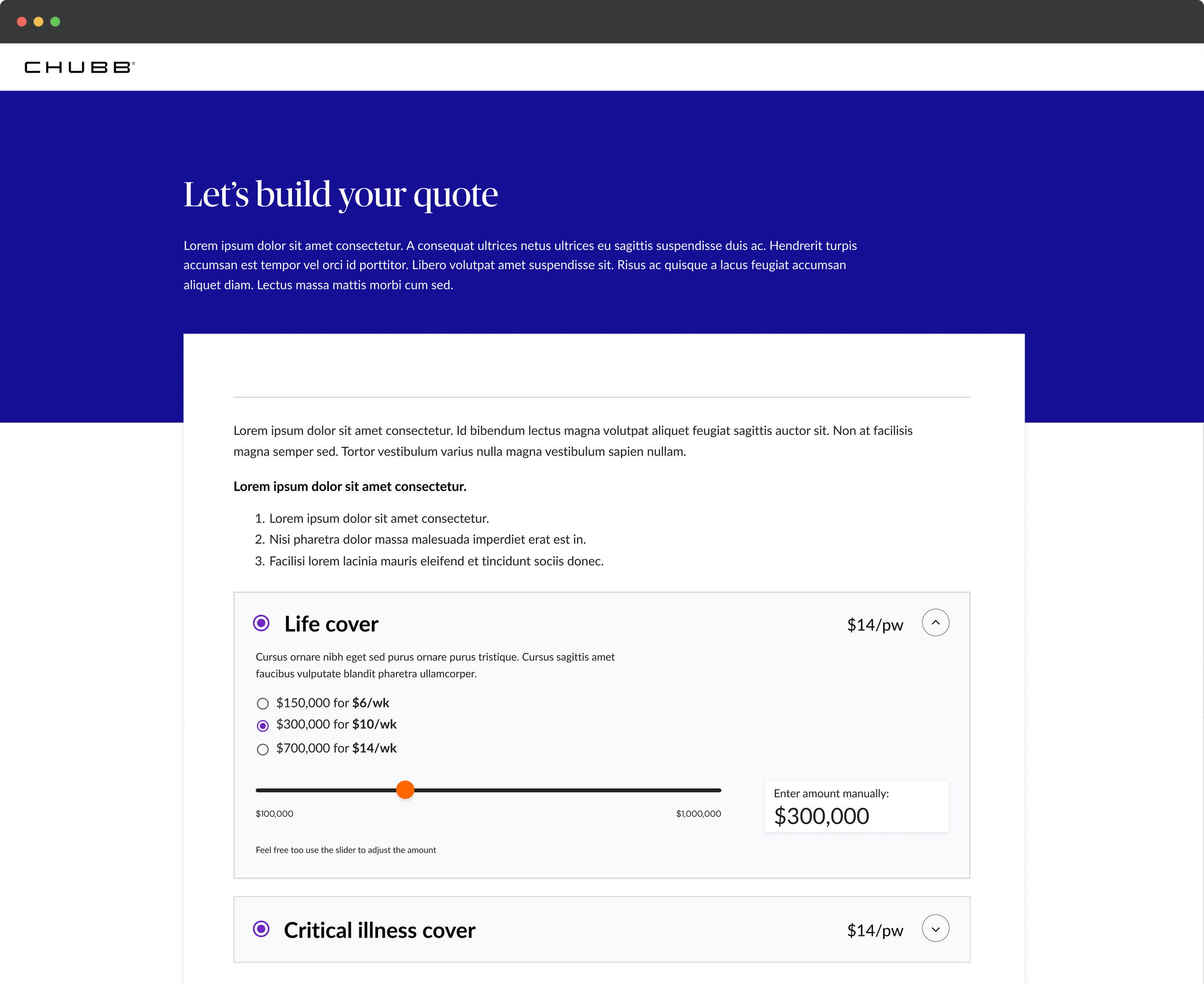 Chubb stands as a prominent leader in the realm of life insurance within the nation. My previous agency has been a long-term partner of Chubb, collaborating on a range of projects with their internal teams, and act as UX consultants and architects to provide a great online experience for their customers.